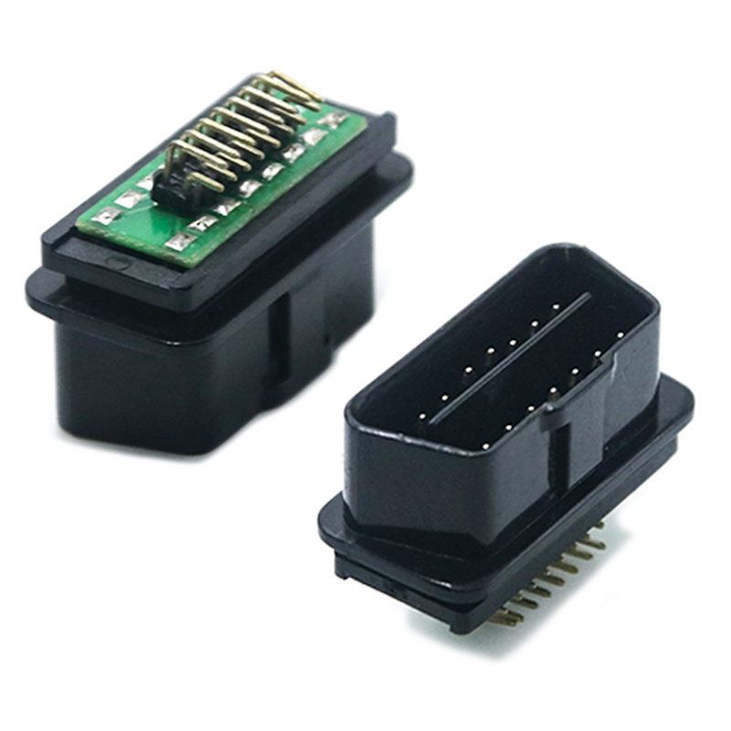 The Right angle OBD connector 16 pin is a special designed J1962 male OBDII connector with 16 pins, suitable for soldering PCB boards on the back.